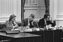 Though she did not consider herself to be a feminist,[4] Kappeyne often tackled issues which were important to women. She advocated for the government to increase the number of women who were involved in government and civil positions, equal hiring practices, prohibitions of sexual violence against women and girls, legal protections for marital rape victims, equal payment of state benefits for pensions and other benefits.[3] She was one of the Dutch delegates to the World Conference on Women in 1985, which was a part of the United Nations programs for the Decade of Women to evaluate the status of women and establish protocols to enable women real access to socio-economic, cultural, legal and political parity.[6][7] She made history at the conference by introducing, for the first time at an official UN Conference, the concept of lesbian rights, calling for an end to discrimination and protection of their legal rights.[6][8][9] Kappeyne helped shepherd the Emancipation Plan Domestic Affairs, which had been introduced by her predecessor, Hedy d'Ancona. The plan, approved in 1985, provided for improvement in efforts to help women attain economic independence by ensuring gender equality, changing organizational structures which favored gender imbalance, and re-imaging the perception of femininity and masculinity. That same year, she introduced the concept of flexible parental leave.[3]