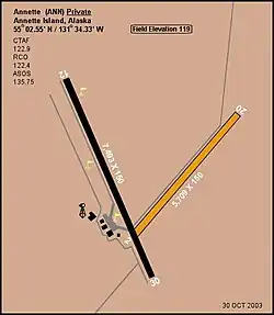 Annette Island Airport (IATA: ANN, ICAO: PANT, FAA LID: ANN) is located on Annette Island in the Prince of Wales – Hyder Census Area of the U.S. state of Alaska.[1] It is located 5 nautical miles (9 km) south of Metlakatla, Alaska.[2] The airport was established as the Annette Island Army Airfield during World War II and initially served as a military airbase.