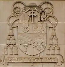 Bishop Mussio's coat of arms on the facade of Holy Name Cathedral in Steubenville.