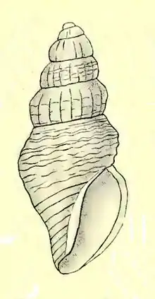 (Original description) The small shell has an elongate-fusiform shape. It is thin and fragile, white, turreted, axially costate and spirally striated. The sculpture consistis of narrowly rounded, slightly oblique axial riblets, about 16 on the body whorl, nearly continuous over the whorls, obsolete on the base. The interstices are slightly broader than the riblets. They are crossed by spiral threads,4 fine and close together on the shoulder, 1 on the carina of the whorl, and 3 below it, the uppermost of these at some distance from the keel. The crossing-points are produced into small oval gemmules. The base is spirally striate, all the striae in front of the aperture being smooth. The colour of the shell is white. The spire is elevated conic, turriculate, nearly 1½ times the height of the aperture. The protoconch is globular, of 1½ smooth whorls, the nucleus broadly rounded. The shell contains 6 whorls, regularly increasing, with a high sloping shoulder, the keel on the spire-whorls near the middle, flat above and below the keel. The base of the shell is contracted. The suture is somewhat impressed, lightly margined below. The aperture is pyriform, broadly angled above, with a short, broad, oblique, and truncated siphonal canal below. The outer lip is convex, thickened by an axial rib, slightly angled above, and somewhat contracted below, with a shallow broad sinus at the suture. The columella is slightly oblique, lightly excavated towards the straight parietal wall, curved below, and extending to the left margin of the siphonal canal. The inner lip is thin, narrow and smooth.[2]