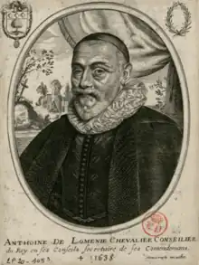 Antoine de Lomenie, lord of La Ville-aux-Clerics (1560 - 17 January 1638 Paris) was a Secretary of the Navy under Louis XIII of 7 November 1613 to 10 August 1615, and Ambassador Extraordinary of France to England.