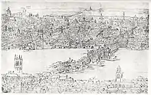 Van den Wyngaerde's first known work, from around 1544, was a topographical view of Dordrecht.[2] As he was trained in the Antwerp school, he created his views using observations from nature.[3] A large view of London in 14 sheets is dated to 1544, including a plan of Whitehall Palace, which he redrew for Henry VIII of England.
