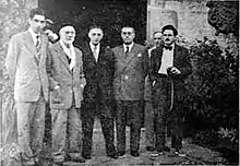 Arrúe maintained very good relations with the Carlist political leader; he shared Fal's intransigence on dynastical and anti-Francoist issues, while Fal shared and supported Arrúe's drive to promote the Basque identity.[54] Though in 1953 the Gipuzkoan junta was reconstituted under Ignacio Ruz de Prada and with Pablo Iturria as its secretary, it was in fact Arrúe remaining the provincial leader.[55] One scholar suggests that Arrúe conspired against Fal, considering him too conventional in his anti-Francoist bid;[56] if this is the case indeed, the ensuing deposition of Fal and collaborationist turn of mid-1950s caught Arrúe bitterly disappointed; he was leaning to a Sivattista dissidence.[57] With José María Valiente emerging as a new national jefe, in 1956 Arrúe tried to oppose his course by forming Junta del Regiones;[58] this semi-rebellious body was bent on preventing rapprochement with Francoism and envisioned a loose alliance of Carlists, nationalists, regionalists, Catholics and even some sectors of the Falange.[59] The junta proved to be short-lived and some of its participants soon backtracked when challenged by Valiente, but Arrúe did not.[60] In 1957 as Gipuzkoan jefe he automatically entered the newly formed Junta de Gobierno de la Comunión[61] and kept confronting the new leader, accusing him of betraying the Carlist spirit.[62] In early 1959 he resigned as jefe of Gipuzkoan Carlism, quoting disagreement with policy of the new Secretariat.[63]