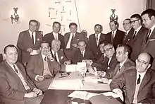 On July 22, 1969, Arrúe recorded the second of the two most emotional moments in his political career: in an open, one-by-one Cortes voting in front of Franco he voiced against Juan Carlos de Borbón as the future king of Spain.[88] Paradoxically, at that time he was increasingly alienated by the pro-democratic turn of the dynasty he remained loyal to. Though when in 1970 Carlos Hugo established his Gabinete Ideologico, Arrúe joined its foral commission, he remained in this body no longer than until 1971.[89] Following a scandal related to re-election negotiations of the Navarrese MPs,[90] he broke up with Partido Carlista, now firmly controlled by the socialist progressists,[91] and did not run in the 1971 elections.[92] He kept considering himself a Traditionalist[93] and an immense portrait of the Carlist king Javier I remained in his office.[94]