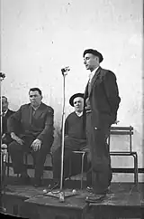 Arrúe became a public figure after the three Traditionalist streams merged into a united Carlist organization, Comunión Tradicionalista, in 1932. In 1933 he was already reported as an active speaker at local Carlist meetings, mostly in minor Gipuzkoan localities like Isasondo.[21] In the summer of 1934 his activity became indeed hectic and was recorded also in major cities like San Sebastian.[22] Soon gaining recognition as “notable orador”,[23] Arrúe delivered vibrant harangues in Basque that sparked the enthusiasm of the audience.[24] His speeches covered key Carlist topics: siding with the Church against Republican secularization, hailing Gipuzkoan caserios as bulwarks of loyalty, defending traditionalist monarchy as a warrant of regional fueros and confronting Basque nationalism as illusory and deceptive; there were also some social threads present.[25] He spoke firmly against the autonomy draft, denouncing it as "antivasco, antiforal y exótico".[26] Nominated secretary of the Carlist Junta Provincial of Gipuzkoa,[27] he continued with public appearances – already dubbed “infatigable secretario” – throughout 1935[28] and early 1936.[29]