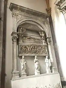 A monumental tomb was built for Carafa between the 1440s and 1480s, probably by the workshop of Jacopo della Pila on the orders of his son Diomede.[11] An inscription commemorates its construction and celebrates Carafa as the man responsible for bringing Alfonso to Italy: