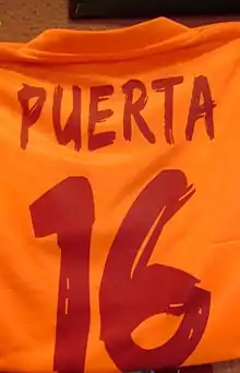 Sevilla subsequently retired Puerta's number 16 shirt, with the provision that should his son, Aitor Antonio (born 22 October 2007),[16] one day play for the club, he would have the option to bring the number out of retirement.[17] However, Spanish football teams were not allowed to do so, as the Royal Spanish Football Federation stated that clubs should use number 1 to 25 for their regular squad, with no additional room for manoeuvre; as a result, David Prieto wore the shirt in 2007–08 in honour of his friend[18] but it was later decided that only youth products could wear that jersey.[19]