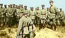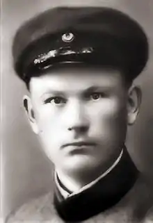 By late 1916 and early 1917, Isotalo was one of the most wanted men in Finland. Governor-General Franz Albert Seyn had ordered a massive search for him known as the "Siege of Härmä"[13] and af Enehjelm convinced the Swedish authorities to treat Jägers as dangerous criminals. Swedish police surprised Isotalo in Haparanda in late January, but he evaded capture by running off into the snow-covered woods without shoes.[14] He returned to Germany in February, completed his training at Lockstedt, Libau and Polangen, and was promoted to hilfsgruppenführer (auxiliary squad leader) at autumn 1917. He entered the Finnish White Army as a varavääpeli (equivalent to a rank between staff sergeant and sergeant 1st class) in February 1918 and was a ceremonial flagbearer when the Jägers swore their oath to the nation of Finland at the Holy Trinity Cathedral in Libau before leaving their German service.[15]