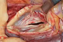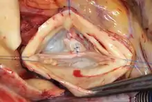 Repaired bicuspid aortic valve. The stretching of the fused cusp has been corrected by sutures, the correct coaptation of the cusps is easily visible.