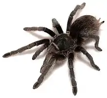Aphonopelma marxi is generally dark brown to black in color, very hairy, with some orange to red hairs on the abdomen. The mature male's carapace ranges from 8.3 to 10.5 mm (0.33 to 0.41 in) long, the mature female being larger, with a carapace from 13.5 to 15.3 mm (0.53 to 0.60 in) long.[2] The total body length of a female, including the chelicerae, is around 35 mm (1.4 in).[3] A. marxi can be distinguished from other species of the genus living in the same places by its dark color, overall hairy appearance, size and habitat. In males, the ratio of the length of the femur of the first leg to the length of the metatarsus of the same leg is greater than 1.69, whereas in similar species the ratio is smaller. In females, the ratio of the length of the femur of the first leg to the length of metatarsus of the third leg is greater than 1.76, being smaller in similar species.[2]