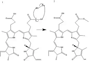 Chemical mechanism for aplysioviolin biosynthesis. An enzyme provides a methyl group that the right-sided hydroxyl selectively attacks, forming the methyl-ester moiety that characterizes aplysioviolin.