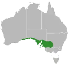 The Aprasia species are noted as one of the most divergent genera from the Pygopodidae family.[3] The Mallee worm-lizard (Aprasia inaurita) is a part of the Aprasia genus which is predominately found in Southern Australia, with the Mallee worm-lizard itself being distributed across a narrow band which stretches from the southeast of Western Australia, across southern South Australia, the northwest corner of Victoria and southwestern New South Wales.[7] The IBRA (Interim Biogeographic Regionalisation for Australia) regions that the Mallee worm-lizard occurs in NSW are the Murray Darling Depression and Riverina regions, with 8% occurrence across New South Wales’ reserves.[2] More specifically, the Mallee worm-lizard has been discovered through the Mallee region between Balranald and Gol Gol with centralised recordings of the Mallee worm-lizard in the Mallee Cliffs National Park area.[2][5] Recordings of the Mallee worm-lizard have also been found in the central mallee region around Pulletop and Gubbata Nature Reserves and around the Scotia Mallee area.[2]