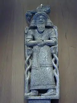 The toponym A-ra-mu appears in an inscription at the East Semitic-speaking kingdom of Ebla listing geographical names, and the term Armi, the Eblaite term for nearby Idlib, occurs frequently in the Ebla tablets (c. 2300 BCE). One of the annals of Naram-Sin of Akkad (c. 2250 BCE) mentions that he captured "Dubul, the ensí of A-ra-me" (Arame is seemingly a genitive form), in the course of a campaign against Simurrum in the northern mountains.[15] Other early references to a place or people of "Aram" have appeared at the archives of Mari (c. 1900 BCE) and at Ugarit (c. 1300 BCE). There is no consensus on the origin and meaning of the word "Aram", one of the most accepted suggestions being that it is derived from a Semitic root rwm, "to be high". Newer suggestions interprets it as a broken plural meaning "white antelopes" or "white bulls".[16] However, there are no historical, archaeological or linguistic evidences that those early uses of the terms Aramu, Armi or Arame were actually referring to the Arameans; thus, it is believed to originally be a toponym without any ethnic connotations.[3] The earliest undisputed historical attestation of Arameans as a people appears much later, in the inscriptions of Tiglath Pileser I (c. 1100 BCE).[17][18][19]