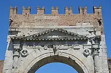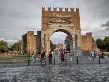 The Arch of Augustus is a gate in the former city wall of Rimini, Italy, in the form of a Roman honorary or triumphal arch.[1] The arch was dedicated to the Emperor Augustus by the Roman Senate in 27 BC and is claimed to be the oldest large Roman arch still surviving. It marked the end of the via Flaminia, which connected the cities of Romagna to Rome, and spans the modern Corso d'Augusto (the ancient decumanus maximus), which led to the beginning of another road, the via Emilia, which ran northwest to Piacenza.[2]