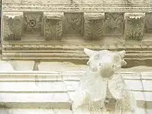 The two sides of the arch were identical, but the outer face is now better preserved, with the columns reaching up to their capitals, which they do not do on the inside face. The four clipei (shields) placed next to the capitals each depict Roman divinities: Jupiter and Apollo on the Roman side, Neptune and Roma facing the city of Rimini. The keystone of the arch on each side has a projecting bull;[7] that on the inside face is better preserved.