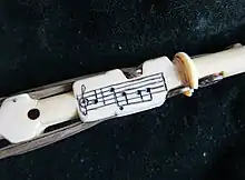 Archie Dagg's musical signature A DAGG, on the front of the chanter of his extended ivory and silver smallpipes.