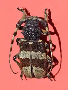 Arctolamia fasciata can reach a length of about 31 millimetres (1.2 in) and a body width of about 11 millimetres (0.43 in). Body is almost rectangular and elytra have two wide dark brown transverse bands on a greyish background. Pronotum is black, with many irregular wrinkle and sharp spines. Elytra and legs are densely hairy. In males antennae are longer than the body. Antennal segments show black or brown long tufts.[2]