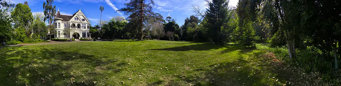 George W. Patterson was born in Pennsylvania in 1822 and came to California as a forty-niner during the California Gold Rush.[2] He came to Alameda County in 1851, after not having success in mining.[2] The Patterson House (also known as the George W. Patterson House) was first constructed as a humble farm house in 1857 by the original owner, George Washington Patterson and his neighbor James Hawley.[1][3][2] The original house was a two-story farmhouse built in redwood and having a rectangular floor plan and a gable roof.[2] The original structure is now seen as the dining room, smoking room, pantry, half bath, and two upstairs bedrooms and a full bathroom.[2]