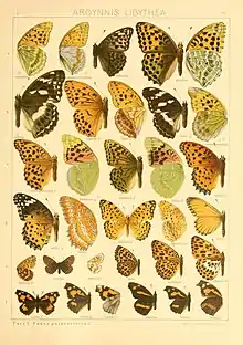 zenobia Leech (71a). Smaller than the previous species [A.childreni] , particularly the hindwing less large. Shape and upperside almost exactly as in paphia; fiery reddish yellow, the male with black scent-streaks on the two median branches. The underside as in childreni, but the silverbands anastomose in several places. In North and West China and Tibet. — In penelope Stgr. the male has 3 scent-streaks instead of 2 on the forewing, and the female is shaded with dull greyish green nearly as in the valesina-female of paphia. On the Sutchou, in Amurland and North China. — The butterflies are on the wing in June and July, not being rare in the south and west of the distribution-area, but very rare in the northern districts, on the Ussuri (Doerries).[2]