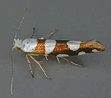 Argyresthia brockeella is a moth of the family Yponomeutidae. It is found in Europe,[1] east Siberia and Japan. The wingspan is 9–12 mm. The head and thorax are white. Forewings are deep coppery-golden; a spot on base of dorsum, a fascia at 1/3, three posterior semioval costal spots and a larger tornal spot shining white; sometimes the fascia is connected with adjacent costal and dorsal spots. Hindwings are grey. The larva is pinkish-brown; head brown; plate of 2 partly blackish-edged.[2]