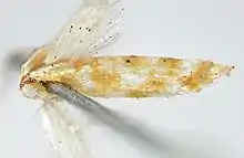 The length of the forewings is about 3.4 mm. The forewings are lustrous yellowish white with the basal and apical areas yellowish orange. The antemedian, postmedian and subterminal fasciae are yellowish orange, oblique and indistinctly outlined. The hindwings are lustrous yellowish white.[1]