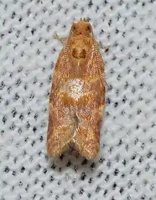 The wingspan is 12–17 mm.[4] The forewings are reddish-orange with two off-white oblique lines. The hindwings are smoky coloured. There are two generations per each year.