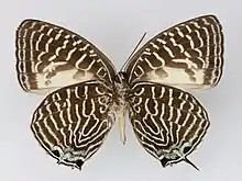 Looks beneath almost exactly like sangira, but it is at once discernible by the mother-of-pearl white upper surface showing lilac or greenish reflections in a certain light. Margin and apex of forewing blackish, thus superficially resembling the colouring of some Lampides, even of small Pieridae.[3]