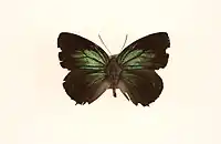 At once discernible from the preceding [related] forms by the broad, proximally irregularly radiating blackish-brown margin of the forewing, being also exhibited in the male the wings of which show a somewhat darker green than the forms of aurea which they resemble somewhat on the under surface excepting the differences in the marking which are to be seen from our figures. The female is like the male but the golden green colour above is replaced by a violettish blue, and the total colouring beneath is somewhat lighter.[1]