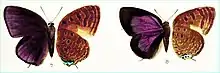 The dark lilac upper surface almost black with a deep blue reflection with a lilac gloss in the disc of the wing; the female with a very broad blackish-brown marginal band; the postmedian transverse band on the forewing beneath is only flawed in the centre, not broken through.[4]