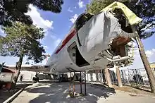 The aircraft was reported to have skidded off the runway. The cockpit area of the aircraft was destroyed by the impact with the airport perimeter wall. Nineteen people were reported to have been injured in the accident.[5] The weather was good at the time of the accident, with the METAR in force at the time reading "METAR OIMM 241300Z 08014KT CAVOK 34/M03 Q1012 A2989".[6] This translates as, METAR for Mashhad International Airport, issued on the 24th of the month at 13:00 UTC, wind at 14 knots (26 km/h), wind direction 080°; ceiling and visibility OK; temperature 34 °C; dew point −3 °C; altimeter 1012 millibars or 29.89 inches of mercury.[7] The aircraft landed with a crosswind.[2] It landed "long" and overran the end of the runway, hitting a wall located more than 1,100 metres (1,200 yd) further on, which demolished the forward section of the aircraft.[2][8][9]