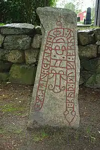 Småland Runic Inscription 2 or Sm 2 is the Rundata designation for a now-lost Viking Age runestone which is believed to be hidden within one of the churchyard walls. Before the historic significance of runestones was understood, they were often re-used as materials in the construction of churches, walls, and bridges. The text of the stone was recorded during one of the earlier national surveys of runestones. It states that the stone was raised by a man named Ábjôrn in memory of a man named Tóki Óníðingr. The name Óníðingr, which with the ó- prefix means the opposite of the Old Norse pejorative word níðingr, was a word used to describe a man as being virtuous. Óníðingr is used as a descriptive word in some runic inscriptions and is translated in the Rundata database as "unvillainous." It is used as a descriptive term on inscriptions Ög 77 in Hovgården, Sö 189 in Åkerby, Sm 5 in Transjö, Sm 37 in Rörbro, Sm 147 in Vasta Ed, and DR 68 in Århus, and appears as a name or part of a name on inscriptions Ög 217 in Oppeby and Sm 131 in Hjortholmen.[3]