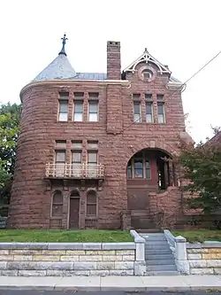 A Richardsonian Romanesque style facade of rough-cut brownstone with a metal gabled roof was added to the existing Italianate Style house. The facade is a two-bay, two-story structure with a full basement, while the main building is only two stories. The two bays of the facade are separated by a central stone chimney. The western side wall of the facade forms a rounded turret with a conical slate roof, and each story has triple one-by-one windows, round-headed on the lowest level and square-headed on the upper two floors. The eastern bay also has the triple windows motif, topped by a gable end with a round window.[4] The front steps are on the east wall and recessed under an archway. The door has stained-glass panels and its landing is laid with colored tiles.