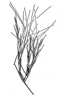 Aristida californica is a clumpy, hairy grass forming bushy tufts up to about 40 centimeters tall in its sandy habitat. The inflorescence contains hard spikelets with a long beak at the tip and awns up to 4.5 centimeters long.