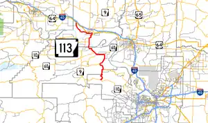 Arkansas Highway 113 (AR 113 and Hwy. 113) is a north–south state highway that runs in Central Arkansas. The route runs 29.48 miles (47.44 km) from Arkansas Highway 10 to Morrilton.[1] This also gives access to some rural areas west of Morrilton. It runs through Pulaski, Perry, and Conway counties. It contains no spur of business routes.[1]