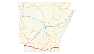 State Road 2 (AR 2, Ark. 2, and Hwy. 2) is a former east–west state highway in the Arkansas Timberlands and Lower Arkansas Delta. The route was approximately 195 miles (314 km), and ran from US Route 67 (US 67) in Texarkana east to cross the Mississippi River near Lake Village, continuing as Mississippi Highway 10.[1] On July 1, 1931, the route was entirely replaced by US Highway 82 (US 82) by the American Association of State Highway Officials (AASHTO). The route was maintained by the Arkansas Highway Department (AHD), now known as the Arkansas Department of Transportation (ArDOT).
