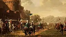 Another archaism during the early years of the 18th century were Hungarian horsemen known as Panzerstecher ("armour piercer"), equipped with an armour piercing sword, mail armour, an iron skull cap with mail aventail and a small shield.[12] Initially, the Hungarian aristocracy did not normally wear mail armour on its own but under a cuirass,[13] but this had changed by the second half of the 17th century,[11] while their old lobster-tailed helmet had made place to the new, simple skull cap with aventail around 1630.[14] Contributing many thousand fighters, the Panzerstecher successfully fought in the Great Turkish War,[15] but after the defeat of the Hungarian uprising of Francis II Rákóczi in 1711, mail armour was restricted to a few hussar captains.[11] It finally disappeared for good after the war of the Austrian succession.[16]