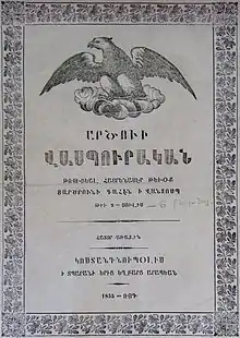 Artsvi Vaspurakan (in Armenian Արծուի Վասպուրական) was an Armenian periodical. It was published monthly, then weekly, in Constantinople and Varagavank from 1855 to 1874 by Mkrtich Khrimian and M. Ananian.