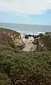 At low tide, there is access to a sand deposit delimited by a rocky wall made from slate and schist forming 30 meters arches resembling cathedral flying buttresses, large caves, sand corridors between rocky blocks, and other geological features. Particularly low tides create access to nearby beaches through the sand extension. As the coast stretch is almost horizontal, the water covers the beach again very quickly.