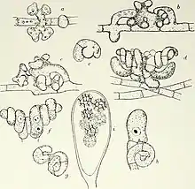 Ascodesmis nigricans is a homothallic fungus.[12] The formation of apothecium begins with the lateral hyphae which then branch dichotomously and form T-shaped gametangial initials. After the germination, these initial organs lengthen and coil helically to form exposed gametangia.[12][13] Then multinucleate hyphae give rise to archicarps, which would develop to ascogonia eventually, and antheridia of A. nigricans.[14] Each archicarps consist of an oogonium which contains approximately 6 nuclei and a trichogyne which contain two nuclei normally. The nuclei of trichogyne disintegrate later. When the communication between oogonia and antheridia is established, male and female nuclei fuse together in pairs in oogonium.[14] In the nuclear fusion process, the nuclear content mix together after the dissolution of the membranes of each nucleus, and larger nuclei would be produced as the final product of this nuclear fusion.[7] Following nuclear fusion, the oogonium expands and about three ascogenous hyphae would develop from it and give rise to asci which then produce ascospores.[14]