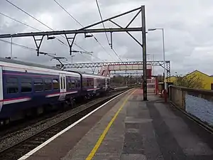 The line was electrified at 25 kV AC on 10 December 1984, replacing the 1500 V DC electrification inaugurated on 14 June 1954 by British Railways as part of the Manchester-Sheffield-Wath scheme via the Woodhead Tunnel.[8] There was also a signal box here, which controlled the junctions and various sidings. The signal box, opened in 1906 by the Great Central Railway, closed in 2011, when control was transferred to the Manchester East signalling control centre.[9][10] The new WCML North Rail Operating Centre is located a short distance east of the station, next to the line to Guide Bridge. This opened in 2014 (one of 11 such centres either built or being planned in the UK) and will eventually control signalling across most of the routes across the North West England, including the northern end of the West Coast Main Line and the entire Manchester area network.[11]