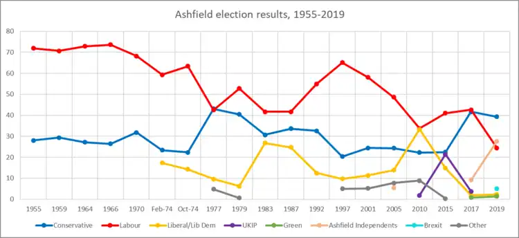 Until the Conservatives gained the seat at the 2019 general election, it was almost always a Labour Party seat since its creation for the 1955 general election. The Ashfield constituency has been served by a former Secretary of State, Geoff Hoon, and since its creation until 2019, for only two years has been served by one member of another party, Tim Smith of the Conservative Party, from 1977 to 1979. Ashfield's 2019 result indicates quite a large Conservative majority. In 2010, the seat had a marginal majority of only 192 votes over the Liberal Democrats, but this was increased to 8,820 in 2015 after a collapse in the Liberal Democrat vote, with the Conservatives finishing in second place. In 2017, there was another narrow margin of victory for Labour after an 8.9% swing to the Conservatives, who squeezed most of the fairly substantial UKIP vote from two years earlier, and also a large vote for the Ashfield Independents candidate of nearly 10%, but Labour on that occasion did just enough to hang on by just over 400 votes. In 2019, the Independent candidate Jason Zadrozny, who had come close to winning the seat for the Liberal Democrats nine years earlier, came second with a substantial vote, and the Conservatives took the seat despite achieving fewer votes and a smaller percentage of the total vote than in 2017.