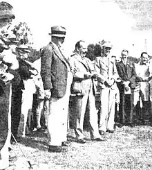 Opening of Ashgove Golf Club, 22 April 1939. Club president, Bruce Shearer, is giving a speech. Queensland Golf Council chairman J. R. O'Keefe is standing to the front at the left.