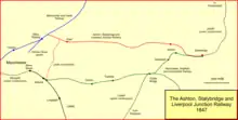 Gooch's survey showed that a line was feasible, and construction was authorised by the Ashton, Stalybridge & Liverpool Junction Railway Act 1844 of 19 July 1844. The Manchester and Leeds Railway was permitted by the act to purchase or lease the AS&LJR. The reference to Liverpool was to the new connection over the M&LR to the Liverpool and Manchester Railway; there was no intention to build to Liverpool.[1][2][3] A Stalybridge branch of the Sheffield, Ashton & Manchester Railway was authorised on the same day. (The SA&MR later was reorganised as the Manchester, Sheffield and Lincolnshire Railway in 1847.) The two Stalybridge terminal stations were to be built alongside one another.[1]