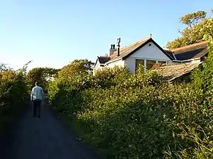 The station still stands. The trackbed through it is now part of the Lancashire Coastal Way, and the platform is just visible from under the foliage.