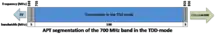 The Asia-Pacific Telecommunity (APT) band plan is a type of segmentation of the 612–806 MHz band (usually referred to as the 600 MHz & 700 MHz bands) formalized by the APT in 2022–2023 and 2008-2010 respectively[1] and specially configured for the deployment of mobile broadband technologies (e.g. most notably Long Term Evolution, LTE). This segmentation exists in two variants, FDD and TDD, that have been standardized by the 3rd Generation Partnership Project (3GPP)[2] and recommended by the International Telecommunication Union (ITU)[3] as segmentations A5 and A6,[4] respectively. The APT band plan has been designed to enable the most efficient use of available spectrum. Therefore, this plan divides the band into contiguous blocks of frequencies that are as large as possible taking account of the need to avoid interference with services in other frequency bands. As the result, the TDD option (segmentation A6) includes 100 MHz of continuous spectrum, while the FDD option (segmentation A5) comprises two large blocks, one of 45 MHz for uplink transmission (mobile to network) in the lower part of the band and the other also of 45 MHz for downlink transmission in the upper part. As defined in the standard, both FDD and TDD schemes for the 700 MHz band include guard bands of 5 MHz and 3 MHz at their lower and upper edges, respectively. The FDD version also includes a centre gap of 10 MHz. The guard bands serve the purpose of mitigating interference with adjacent bands while the FDD centre gap is required to avoid interference between uplink and downlink transmissions. The two arrangements are shown graphically in figures 1 and 2.