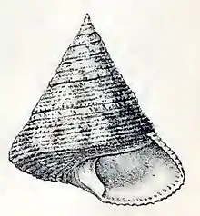 The size of the shell varies between 20 mm and 43 mm. The pyramidal-conical shell is imperforate, flesh-colored, variegated and punctate with rufous. The whorls are plano-concave, sculptured with transverse subgranulate alternately smaller and larger lirae. The granules are reddish brown. The body whorl is obtusely angular. The base of the shell is concentrically grooved. The umbilical region is impressed and bounded by a rufous callus. The aperture is subquadrate. The solid columella is subarcuate and scarcely truncate anteriorly. The outer lip is lirate within. Its margin is subangulate in the middle.[3]