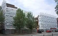 A revised planning application was submitted in December 2013. Although several elements remained the same, such as office accommodation, community facilities and a café/restaurant, the developers now included six flats in their proposal. These would be built at the top of the complex, which would rise to six storeys at the front and three storeys to the rear. No car parking would be provided, but bicycle parking was included in the new design. The city council was expected to decide on the application in March 2014,[33] and in that month granted approval[34] which remained valid as of May 2015;[35] but in December 2014 Holland sold the building to Unicity, part of Knightsbridge Student Housing. This company submitted a new planning application in May 2015 in respect of a building consisting of 73 privately rented flats, offices and community space. The proposed housing density was significantly greater than that for which permission was granted in 2014.[35] This scheme was permitted on appeal; but the building was subsequently sold on again to a company called Ktesius. Their plan for 70 luxury flats called Brighton Rox was granted approval in January 2017.[36]