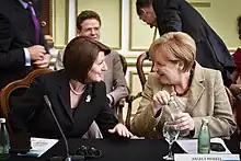 In early 2015, during the great wave of illegal migration of Kosovo citizens to western Europe, Jahjaga was the only leader who visited Kosovo municipalities affected by migration in order to speak with citizens about their concerns.[33] Many European officials have commended Jahjaga for her personal engagement to establish direct dialogue with citizens and her key role in stopping the flow of the citizens of Kosovo to Western Europe.[34]