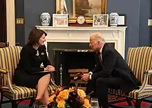 During the local elections of 2013 and early general elections of 2014, she successfully coordinated and mobilized mechanisms of justice and the Central Election Commission for a fair, democratic and transparent electoral process, following Kosovo's rigged general elections in 2010 that drew much concern about the legitimacy of Kosovo's institutions and criticism from international organizations.[20] Due to the efforts led by Jahjaga to ensure a democratic process, according to international monitors, the elections of 2013 and 2014 were fair and inclusive, drawing to the ballot boxes for the first time the citizens of Serb municipalities in the north of the country.[21] Following the June elections of 2014, Kosovo was paralyzed by a political and constitutional deadlock which prevented the formation of institutions and undermined the country's democratic functioning.[22] In an effort to find a solution to the political impasse, President Jahjaga began intensive meetings with leaders of parliamentary political parties in finding the formula for the establishment of the new Parliament and formation of the Government.[23] Jahjaga played a crucial role in resolving the crisis, ensuring democratic functioning of institutions through a credible, transparent and inclusive process, in full respect of the constitutional court decisions and legal procedures. U.S. President Barack Obama, on the occasion of Kosovo's Independence Day, congratulated Jahjaga for her "leadership and resolve in working with party leaders during the extended government-formation process."[24]