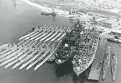 Atlantic Reserve Fleet, New London opened in 1946 at the Naval Submarine Base New London in Groton, Connecticut on the Thames River. The New London Reserve Fleet was 3 miles north of the city New London, Connecticut. Naval Submarine Base New London opened in 1872 as a Navy yard, gained its first submarines on 13 Oct 1915, and earned the designation of Submarine Base in about 1916. The freshwater port became a good site to store both submarines and ships after World War II as part of the United States Navy reserve fleets. Three submarine tender ships were given the task of mothballing the submarines. The three ships: USS Apollo, USS Anthedon, USS Proteus (AS-19) cleaned the ship and sealed the subs with preservatives. It took a few years to process the over 50 submarines in the New London Reserve fleet. Some submarines there were reactivated for the Korean War. By 1965 the fleet of World War II submarine were obsolete and the fleet had been scrapped.[1][2]